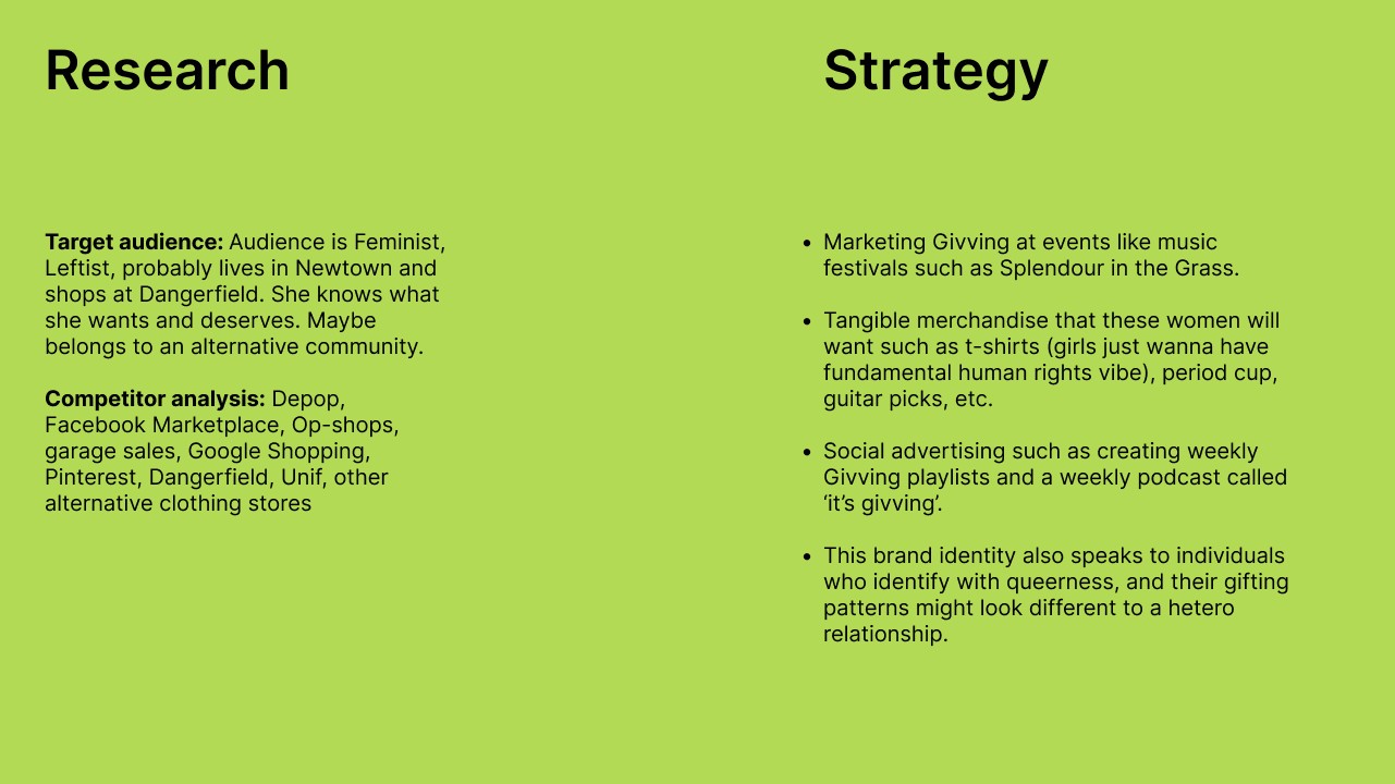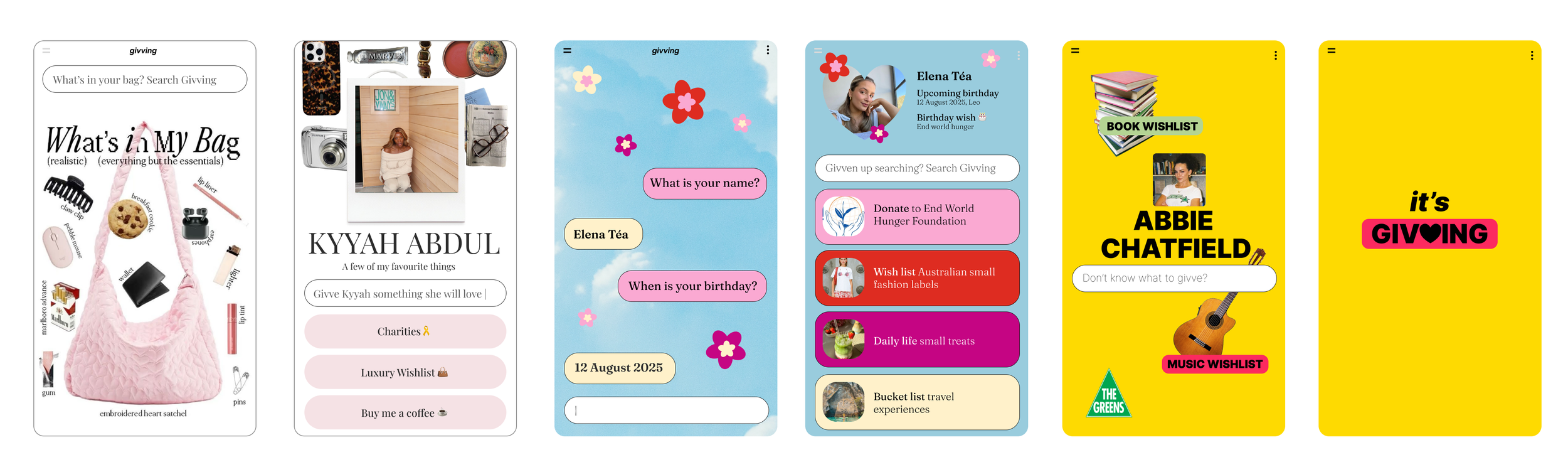 User experience and user interface design was also developed for Givving. The ideas that were chosen were the ‘What’s in my bag’ quiz that allows for the Givving platform to learn about their users favourite brands and items. The interface menus reflect the Personas values, for example the ‘Donate to End Hunger’ button on the second example represents that Persona’s highest desire. The search bar on the second and third example allows for a tailored and easy gifting experience, showing the ‘Givver’ gifts that that Persona would most likely love.