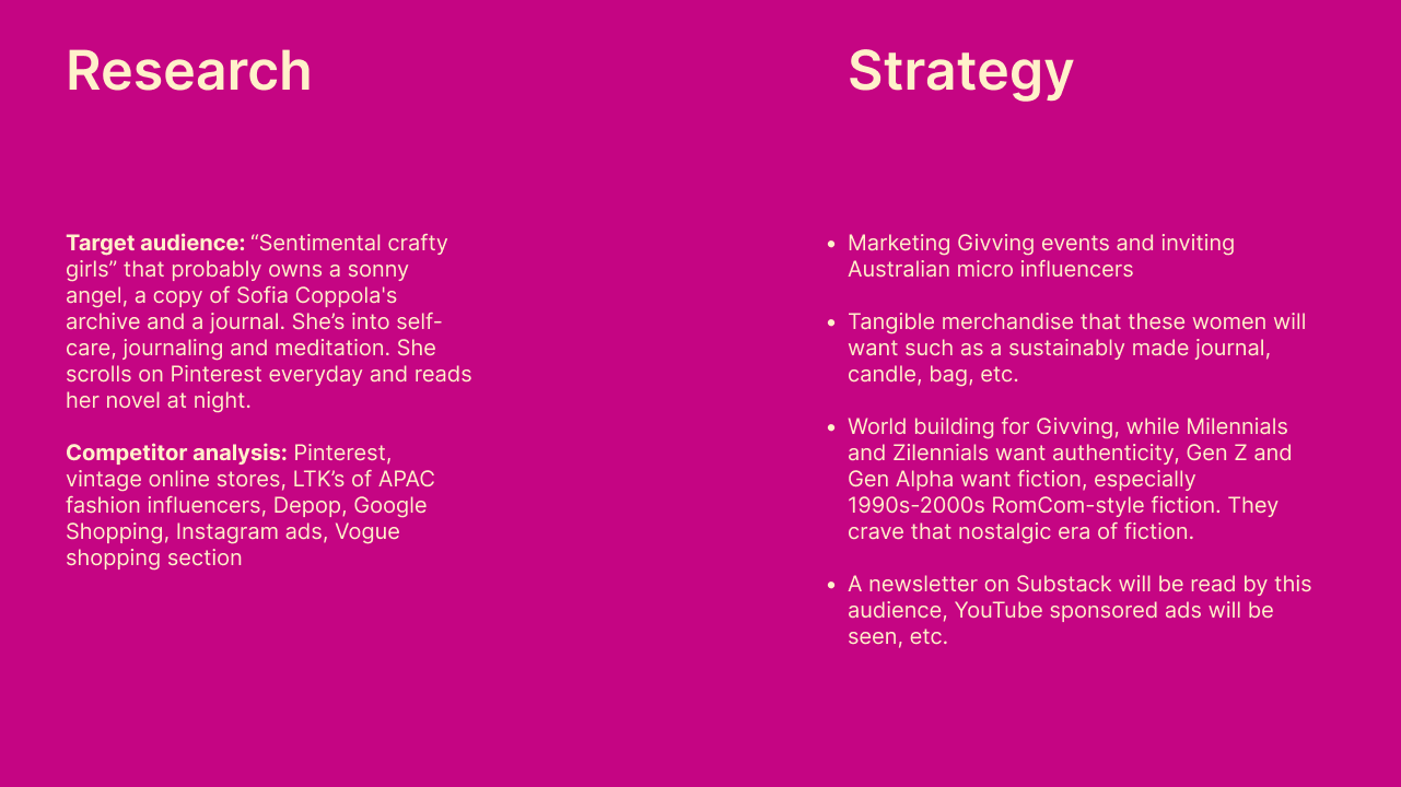 Givving makes the gift giving experience easy and seamless through their gift profile and curated search engine. To the Founder of Givving, everything is fashion. I was tasked with researching and creating a visual identity that is vibrant, bold and future forward while maintaining an editorial feel.
